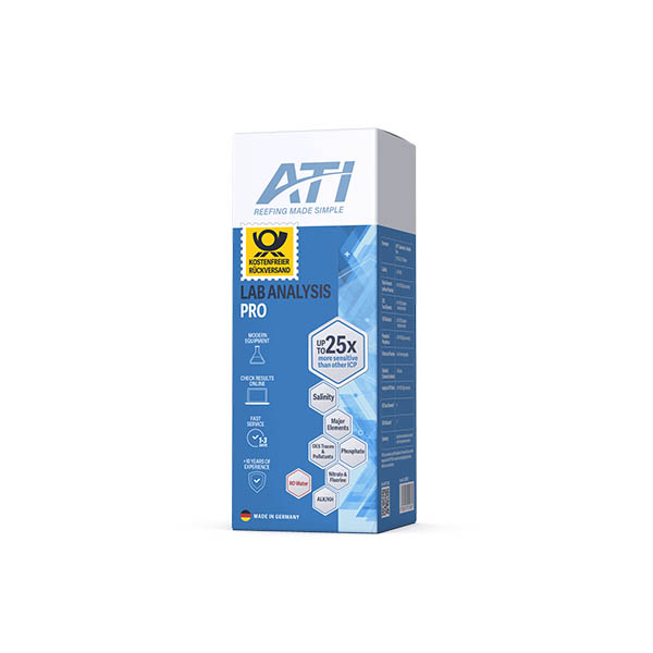 Bei der ATI® Laboranalyse Pro werden neben allen Bestandteilen der Laboranalyse Standard zusätzlich Nitrat, Fluor und die Karbonathärte bestimmt. Ebenso wird über ICP-OES eine Analyse Ihres Osmosewassers durchgeführt. Mit der Laboranalyse Pro erhalten Sie somit eine umfassende Messung, bei der alle wichtigen Parameter mit hoher Genauigkeit bestimmt werden.