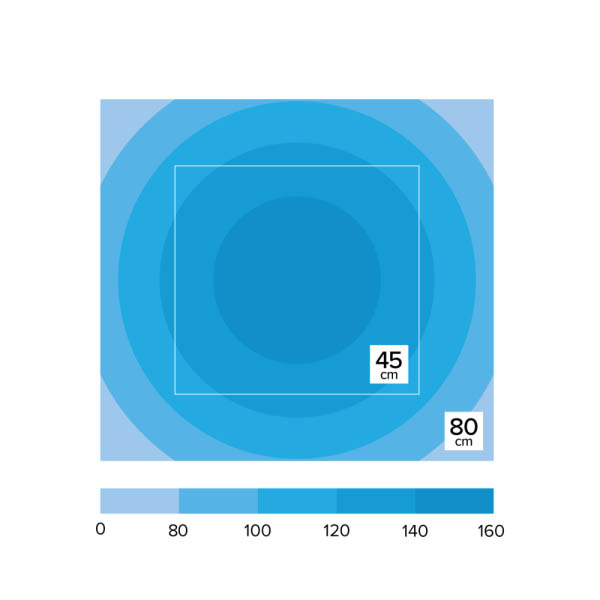 Weitwinkel-Linsen mit Blend-Schatten („anti-glare shade“) rund um die LED-Pucks; klare Optik bei gleichmäßiger Lichtverteilung.