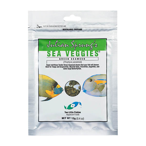 Julian Sprungs SeaVeggies® Grüne Algen (Porphyra yezoensis). Sehr nahrhafte grüne Algenblätter. Ideal für marine Pflanzenfresser wie Doktorfische, Moorish Idols, Papageienfische, Kaiserfische, große Falterfische und Süßwasserfische wie Cichliden und Goldfische. Erhältlich in zwei Größen: 30 g (1 oz) und 12 g (0,4 oz).