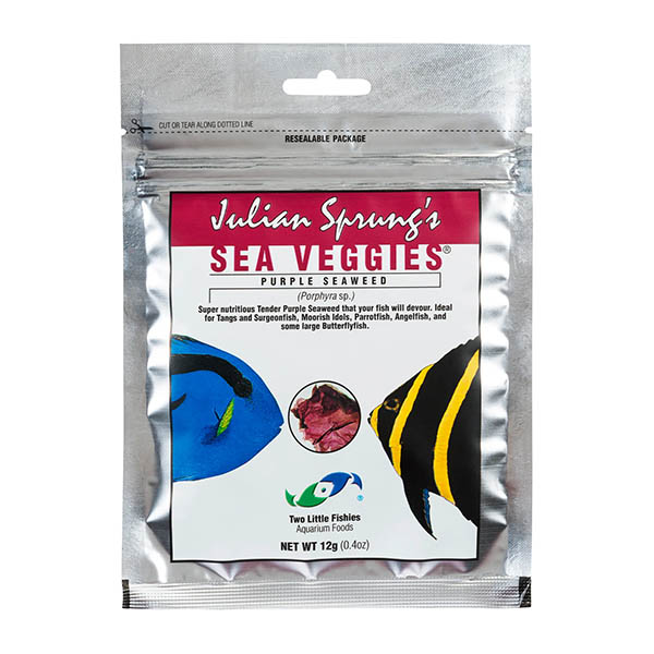 Julian Sprungs SeaVeggies® Purple Seaweed (Porphyra sp.) Super nahrhaftes natürliches Purpur-Seegras. Ideal für marine Pflanzenfresser wie Doktorfische, Moorish Idols, Papageienfische, Kaiserfische, große Falterfische und pflanzenfressende Süßwasserfische wie Cichliden und Goldfische. Erhältlich in 30 g (1 oz) und 12 g (0,4 oz).